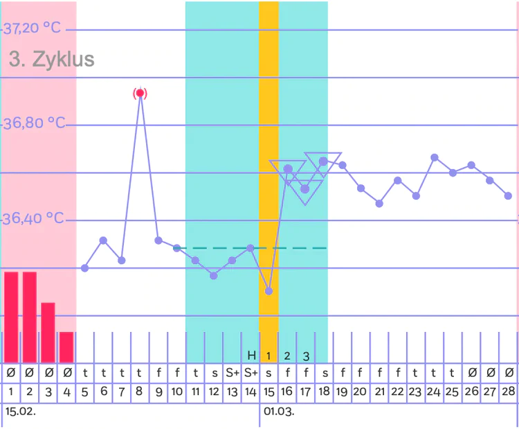 Chaque jour, trackle vérifie à l’aide de tes saisies de glaire cervicale et de ta température basale où tu te trouves actuellement dans ton cycle et si ton ovulation a déjà eu lieu ou non.